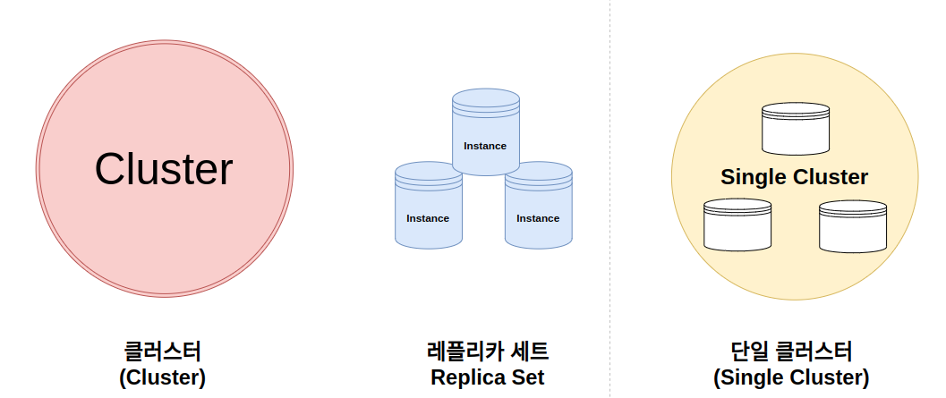 인스턴스들의 모임은 클러스터가 된다. 클러스터는 하나의 시스템처럼 작동한다. 단일 클러스터에서 각각의 인스턴스는 동일한 복제본을 가지게 되는데, 이 모음을 레플리카 세트라고 한다. 클러스터를 이용해 배포를 진행하는 경우 자동으로 레플리카 세트가 생성된다.