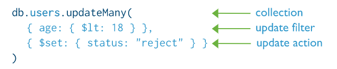 updateOne() 메소드는 필터링에 충족하는 한개의 Document를 갱신한다. 필터는 Document 타입으로 find() 메소드에서와 사용방법이 동일하다. 만약 빈 Document 타입을 추가할 경우 Document에서 가장 첫번째 데이터가 갱신된다.