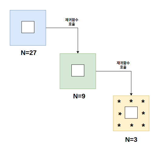 만약 N=27인 경우에서 생각해보면 먼저 블록을 9개로 분리하고, 공백의 조건을 만족하면 공백으로 두고, 공백 조건을 충족하지 못하면 재귀함수를 호출하면서 N=9인 경우를 생각한다. 또 공백 조건이면 공백으로 두고, 아닌경우 재귀 함수를 호출해서 N=3인 경우를 생각한다.