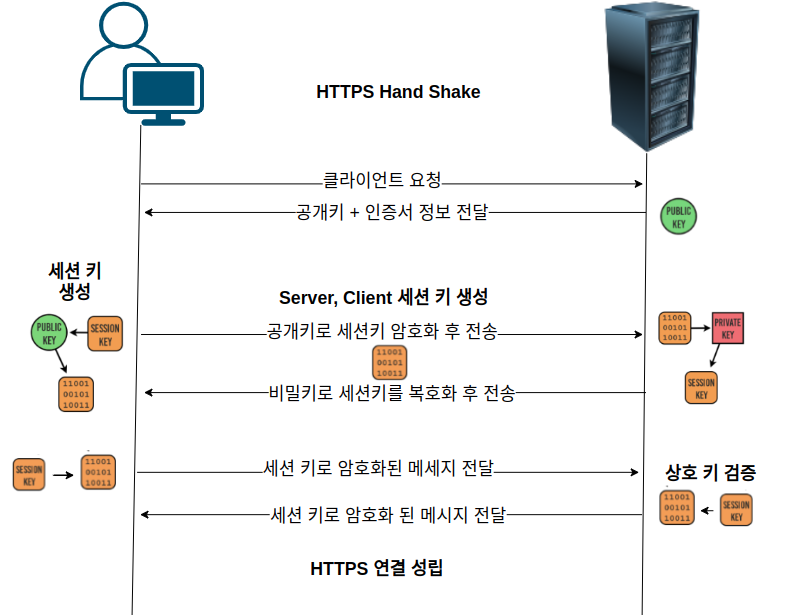 ② 서버가 적합한 인증서를 가졌다면 클라이언트와 클라이언트는 서버로 부터 받은 공개키로 세션 키를 암호화한다. 세션 키를 암호호환 문자열이 서버로 전송된다. 서버는 비밀키를 가지고 세션키를 복호화한다. 여기서 부터 서버와 클라이언트는 세션키만(대칭키)을 가지고 문자열을 전송할 수 있게 된다.