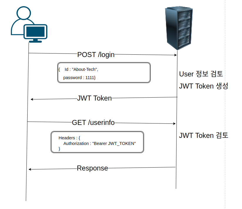 ⑤ 서버는 헤더에 존재하는 토큰을 해독한 후 정상 토큰일 경우 사용자 요청을 처리해 응답한다.