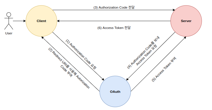 ⑥ Authorization code : Access Token을 발급받기 전 필요한 code. Client는 Authorization Code를 받아온 후 client secret과 code를 사용해 Access Token을 받아오게 된다.