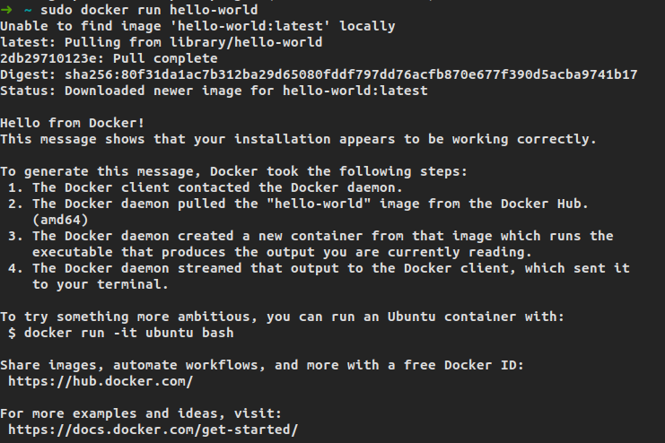 $ sudo docker run hello-world