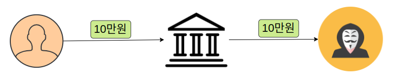 여기서 우리가 메일이나 모바일 SMS로 많이 받아왔던 익숙한 URI 링크가 등장합니다. 이 링크를 확인해보면 account에 우리가 보낼 대상의 계좌번호가 아닌 공격자의 계좌가 심어져 있습니다. 이대로 링크를 클릭하면 koreabank에 공격자계좌로 10만원을 보내는 쿼리가 실행될 것입니다.