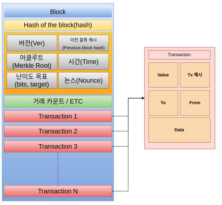 | 입력 리스트 | 블록의 첫 트랜잭션은 코인베이스 트랜잭션이 됩니다. 입력 리스트에는 최소 하나 이상의 트랜잭션 입력이 포함됩니다. |