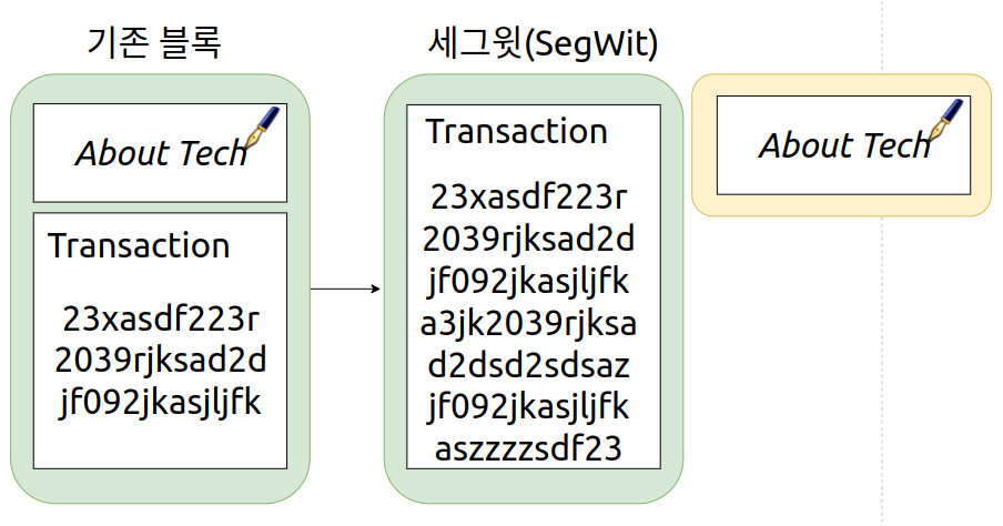 | 내용 | 디지털 서명과 데이터를 분리함 | 블록 용량 증가 > TPS 증가 | 디지털 서명과 트랜잭션을 분리해 데이터 변경 불가 |
