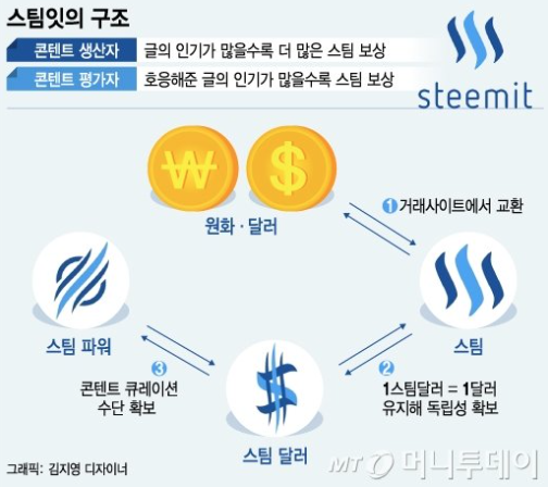 steemit에 글을 쓰거나 Voting에 참여한 유저는 스팀 혹은 스팀달러가 지급됩니다. steemit은 스팀, 스팀파워, 스팀달러 3가지의 암호화폐를 지급합니다. 최초로 Multi-Token Economy와 SNS 플랫폼을 접목시킨 프로젝트로 약 6년 넘게 운영되고 있습니다. 다만 블록체인 기반이기 때문에 비밀번호 잃어버리면 계정 접속이 불가합니다. 또한 한번 포스팅 된 글은 수정/삭제가 불가능하기 때문에 개인정보를 담은 포스팅은 자제해야 합니다.