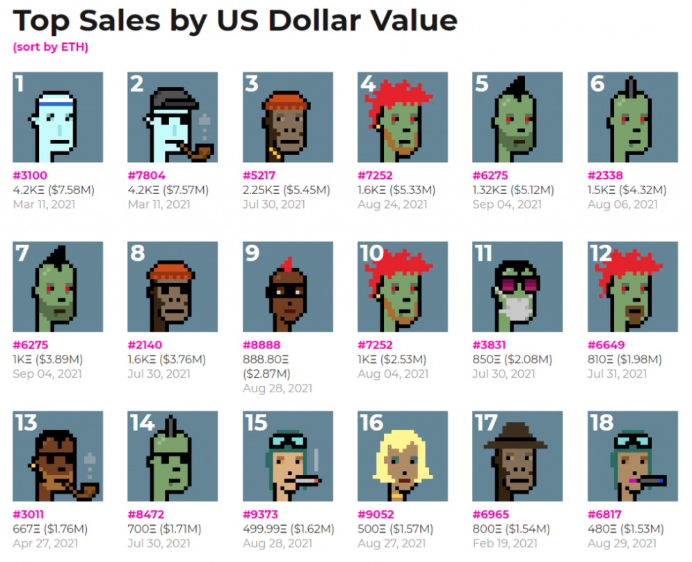NFT 프로젝트에서 가장 유명한 건 크립토펑크(CryptoPunks)입니다. NFT 개념을 사용한 첫 프로젝트기도 하고 억대의 거래가 이뤄지면서 순식간에 유명세를 타게 되었습니다. 크립토 펑크는 홀(Matt Hall)과 존 왓킨슨(John Watkinson)이 2017년 라바랩스로 시작한 프로젝트입니다. 8비트 해상도의 얼굴 아이콘을 1만개 정도 생성합니다. 모든 얼굴은 다르게 생겼고, 남자 6039명, 여자 3840명, 좀비 88명, 유인원 24명, 외계인 9명으로 구성되어 있습니다. 1위 #3100 외계인의 가격이 가장 비싸고, 한화로 약 100억원 정도에 거래되고 있습니다.