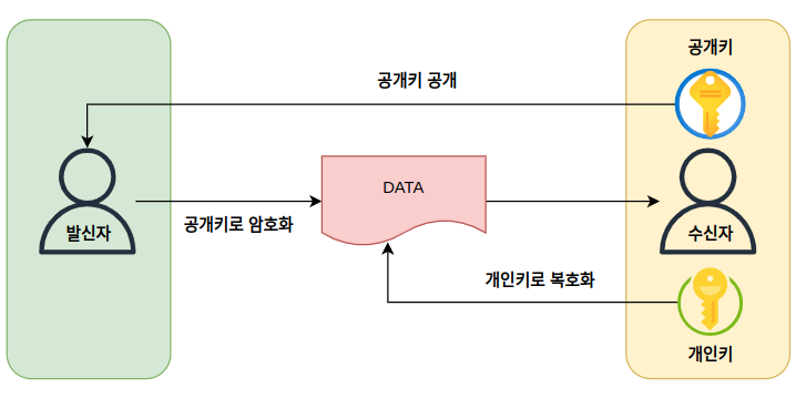 공개키를 사용해 데이터를 암호화 하고 개인키로 복화하는 과정을 거치게 됩니다. 공개키로 암호화된 데이터가 개인키로 복호화 될 수 있어야 하므로, 공개키와 개인키는 알고리즘에 의해 수학적으로 연결되어 있습니다. 암호화/복호화 키가 분리되면서 키 배송 문제를 해결할 수 있게 됩니다.