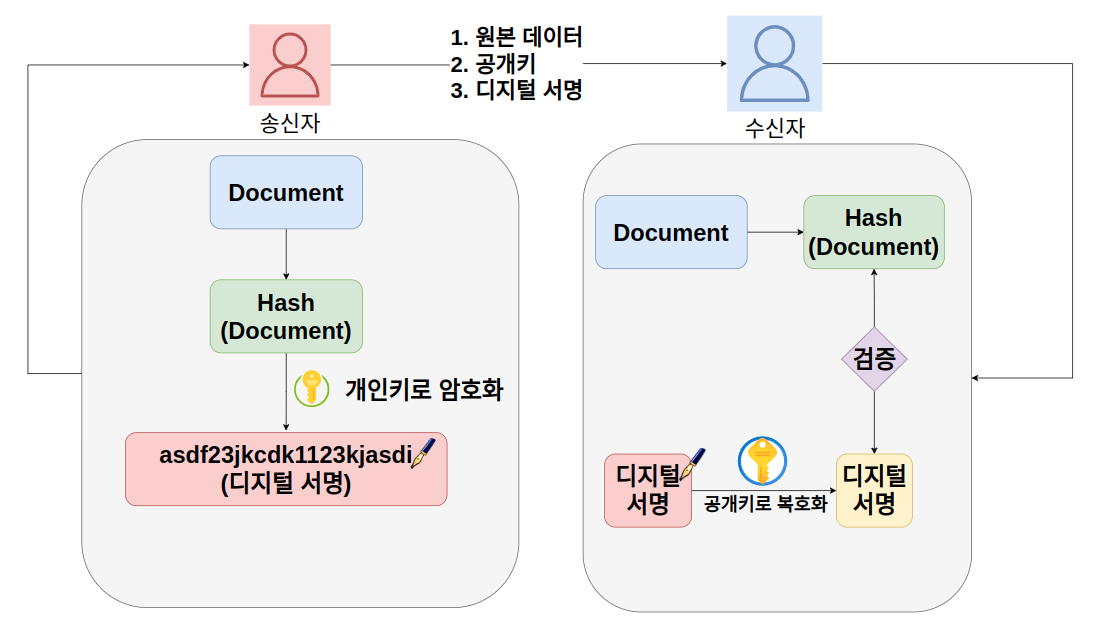 디지털 서명은 전체적으로는 공개키 방식을 사용하지만 추가적으로 해싱, 서명, 검증 3가지 단계로 구분됩니다. 원본 데이터를 해싱한 후 개인키를 사용해 암호화를 합니다. 디지털 서명과 원본 데이터를 전송한 후 수신자는 원본 데이터를 해싱하고 디지털 서명을 공개키로 복호화 한 후 2개의 데이터를 비교/검증합니다.