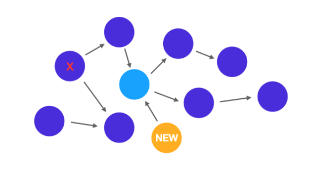 DAG(Directed Acyclic Graph)는 각 정점들이 블록이 아닌 트랜잭션들로 구성되어 있으며, 채굴 과정을 필요로 하지 않습니다. 트랜잭션들은 상호 참조를 통해 유효성을 검증하게 됩니다. 이전 거래 내역들이 새로운 트랜잭션에 담기게 되면서 하나의 트랜잭션만 확인해도 이전의 거래 이력들을 확인할 수 있습니다.