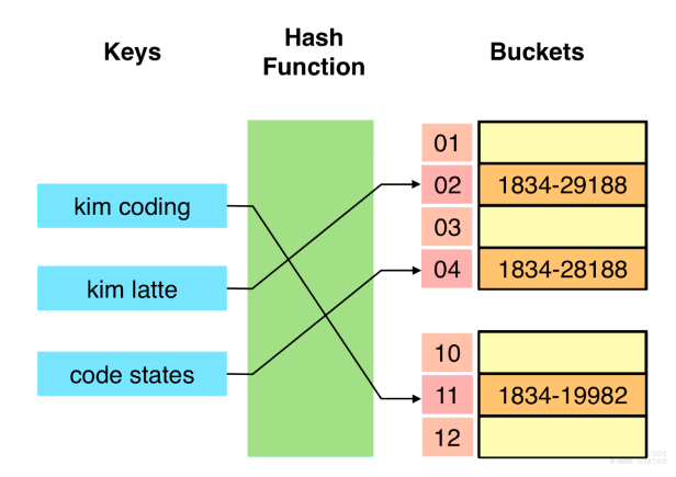 - 해시함수(Hash Function) : 키(Key)를 해시(Hash)로 변환해주는 역할을 담당합니다. 다양한 길이의 키(Key)를 고정된 길이의 해시(Hash)로 변경해 저장소를 효율적으로 운영합니다. 서로 다른 키(Key)가 동일한 해시값을 가지는 해시 충돌(Hash Collision)을 주의해야 합니다.