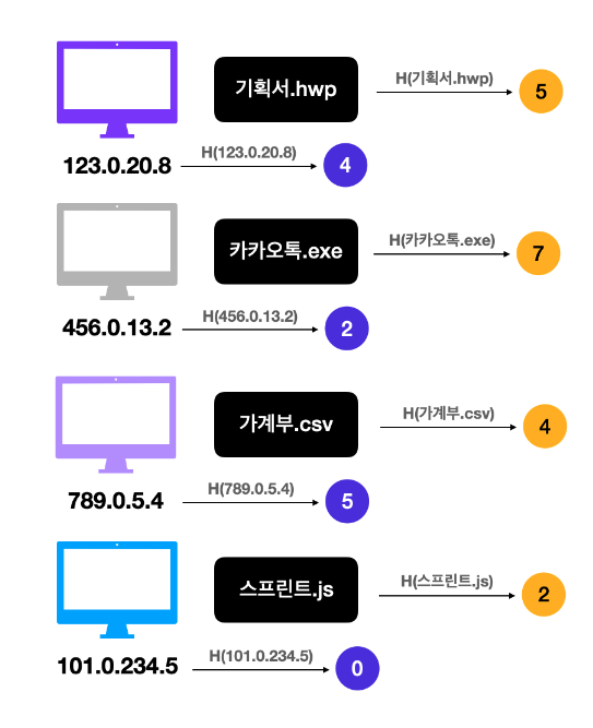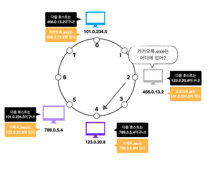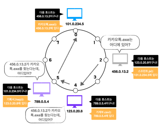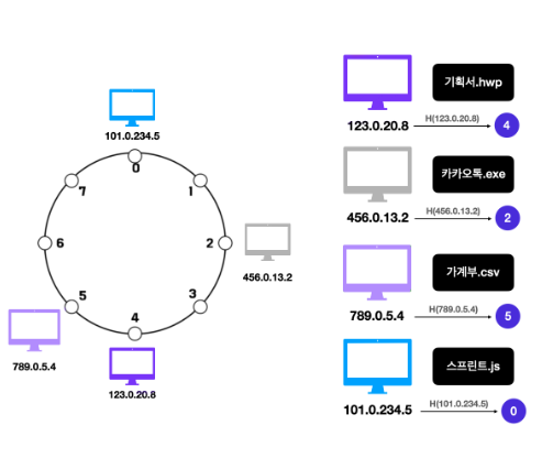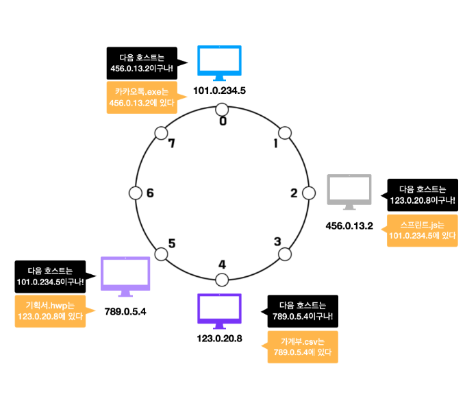 ⑤ 각 호스트들이 공유해야 할 데이터의 위치를 지정합니다. 파일을 해싱한 결과값을 8로 나눠 데이터 위치를 지정하게 됩니다. 예를 들어 기획서.hwp는 주소 5를 가지고, 카카오톡.exe는 주소 7을 가집니다.