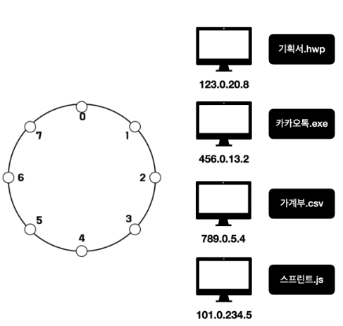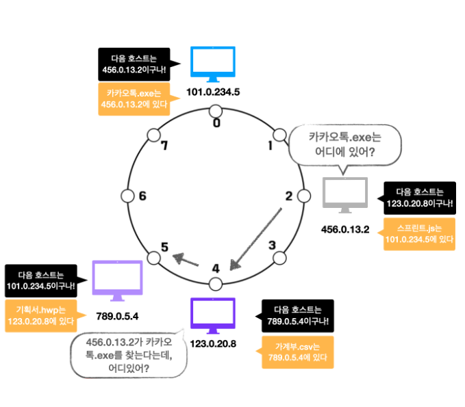 ⑤ 각 호스트들이 공유해야 할 데이터의 위치를 지정합니다. 파일을 해싱한 결과값을 8로 나눠 데이터 위치를 지정하게 됩니다. 예를 들어 기획서.hwp는 주소 5를 가지고, 카카오톡.exe는 주소 7을 가집니다.