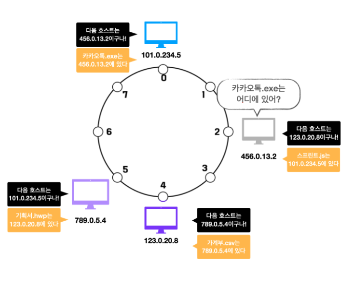 ② 456.0.13.2 호스트는 가장 가까운 다음 호스트인 123.0.20.8 호스트에게 카카오톡.exe가 어딨냐고 물어봅니다.