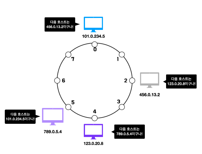 ④ 각 호스트들은 본인 다음에 위치한 호스트 중 가장 근처에 위치한 호스트 주소를 알게 됩니다.