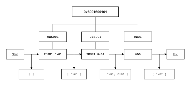 자, 예를 들어 0x6001600101이라는 바이트코드가 있다고 가정합니다. 코드가 실행되면서 바이트코드는 각 바이트로 쪼개 집니다. 즉 0x60 0x01 0x60 0x01 0x01로 쪼개집니다. 첫번째 코드 0x60은 PUSH 연산자입니다. PUSH 연산자 뒤에는 스택에 넣을 데이터가 옵니다. 즉 스택에 1을 PUSH합니다. 두번째 바이트도 동일하게 PUSH 1을 수행합니다. 세번째 명령어 0x01은 ADD 연산입니다. 즉 스택에서 2개의 0x01을 꺼내 합산한 후 다시 결과값을 스택에 넣습니다.