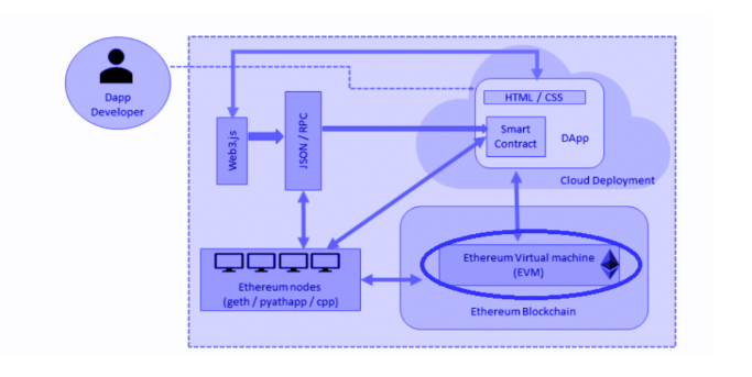 이더리움은 비트코인의 제한적인 기능을 넘어 스마트 컨트랙트 기능을 확장하여 제3의 신뢰 제공자 없이도 거래 이행이 가능하도록 하는 오픈소스 퍼블릭 블록체인입니다. 개발자라면 누구든지 dApp을 만들어 이더리움메인넷에 올려서 서비스를 제공할 수 있습니다. dApp을 개발하기 위한 언어로 솔리디티(Solidity)를 지원하고 있고, 이더리움 메인넷에 올라가는 솔리디티 코드들은 EVM(Ethereum Virtual Machine) 위에서 작동합니다.