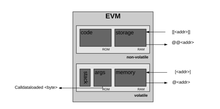 - 스토리지(Storage) : 스토리는 비휘발성입니다. 시스템 상태에 따라 데이터가 유지됩니다. EVM에서는 가상 ROM이라는 공간에 특정 명령어로만 접근하여 프로그램 코드를 분리/저장합니다.