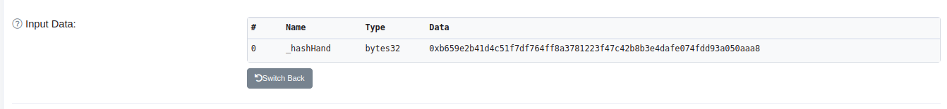 트랜잭션을 확인해보면 방장이 입력한 값(가위를 냈습니다)이 해시값으로 암호화 되어 있어 확인할 수 없습니다. 해당 값을 확인하기 위해서는 해싱할 때 들어갔던 key값을 알아야 합니다.