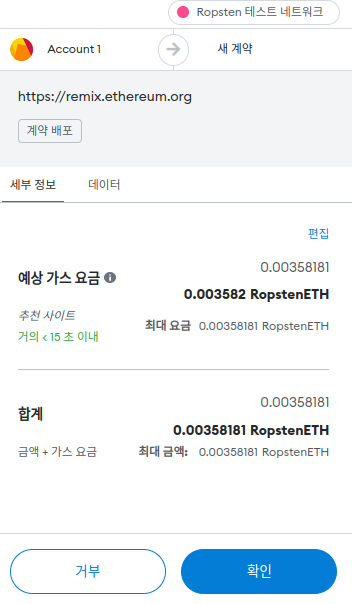 배포(Depoy)를 하면 메타마스크 지갑이 열립니다. 확인 버튼을 클릭합니다.