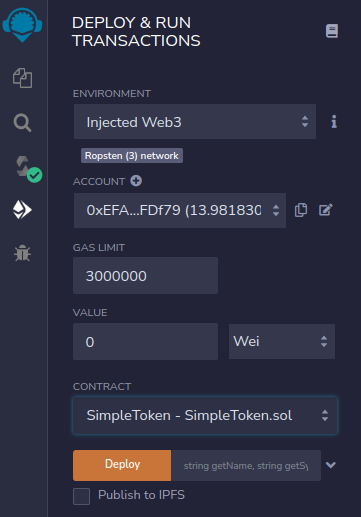 ④ 컴파일한 스마트 컨트랙트를 배포합니다. 메타마스크 지갑과 연동해 Ropsten 테스트넷에 배포할 예정이므로 ENVIRONMENT는 "Injected Web3"로 지정합니다.
