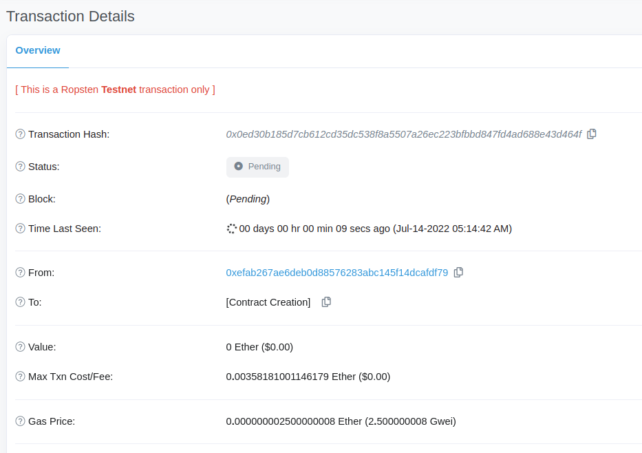 이더스캔에서 배포 현황을 확인할 수 있습니다. 트랜잭션이 올라가고 약 10~20초 정도 뒤 블록이 생성되면서 계약 배포가 완료됩니다.