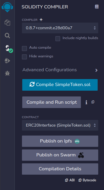 ③ SimpleToken.sol 파일을 컴파일 합니다. 저의 경우 pragma solidity 버전을 0.8.7로 진행했습니다.