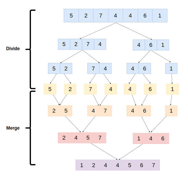 입력 데이터를 LEFT와 RIGHT로 쪼개는 재귀 함수를 구현합니다. 만약 시작점이 종료지점과 같거나 큰 경우 입력 데이터의 첫번째 요소를 반환합니다. 가장 마지막 단계까지 분할이 된 이후 부터 aux() 함수의 반환값인 merge() 함수가 작동하면서 병합되기 시작하고, 입력데이터의 루트 레벨까지 올라오게 됩니다.