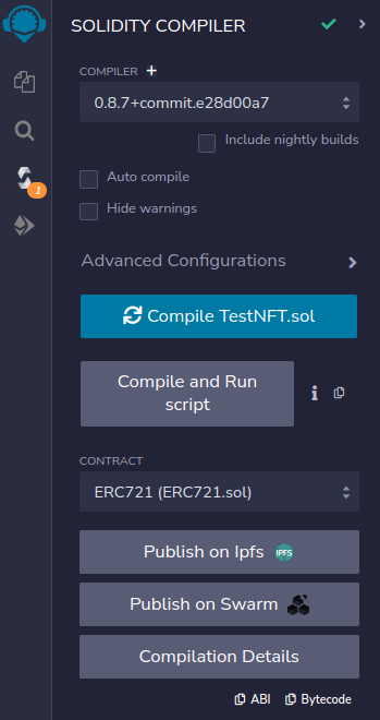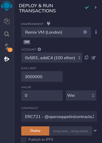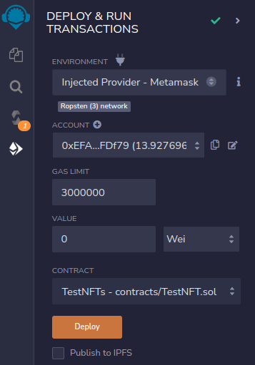 컴파일된 TestNFT 컨트랙트를 선택후 Deploy 합니다.