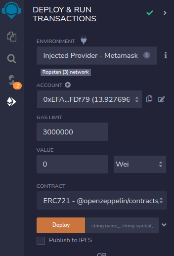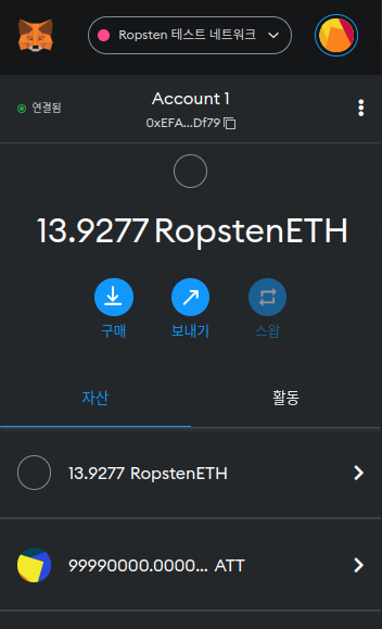 테스트넷에 배포할것이므로 메타마스크 지갑을 오픈하고, Ropsten 테스트넷에 연결된 것을 확인합니다. 만약 Remix IDE와 지갑이 연결되지 않은 경우 연결해줘야 합니다.