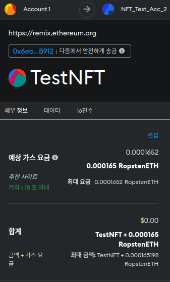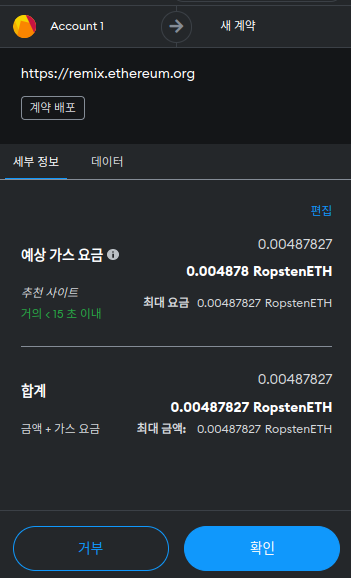 메타마스크 확장 프로그램이 실행되고 계약 배포 확인 창이 팝업됩니다. 가스비가 일정 수준 발생합니다. 배포 트랜잭션을 보낸 후 한 30초 후 컨트랙트가 블록체인에 올라갑니다.