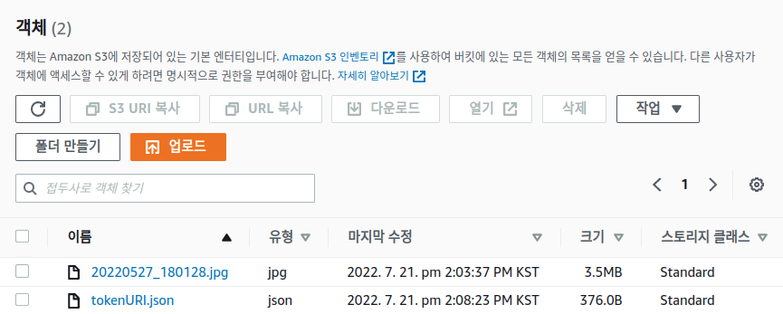 접근 권한 설정이 완료되면 이제, NFT에 올릴 디지털 자산(이미지, 영상, 음악 등등)과 NFT 메타데이터를 담은 JSON 파일을 업로드해줍니다.
