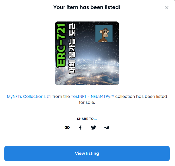두번째 서명은 해당 NFT에 개인키로 서명을 합니다. 서명까지 완료되면 성공적으로 OpenSea Testnet에 제가 만든 NFT가 정상적으로 배포됩니다.