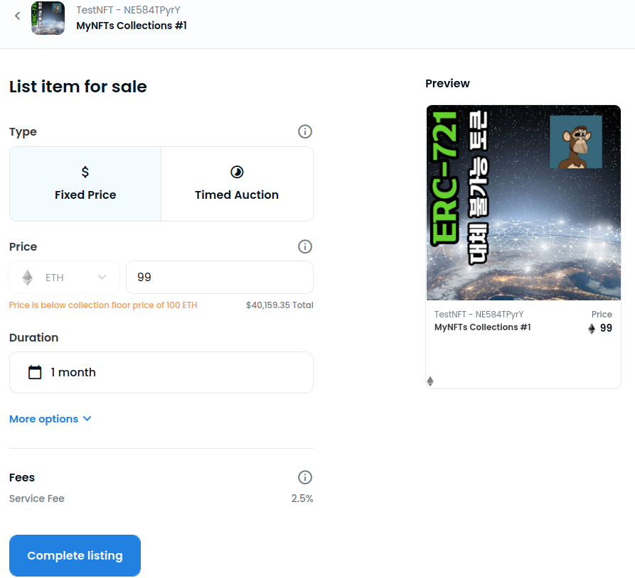 Sell 버튼을 클릭하면 Fixed Price와 Timed Auction 두가지 방법중 하나를 선택할 수 있습니다. 저는 고정 가격으로 99 Rinkeby ETH로 NFT를 올리도록 하겠습니다.