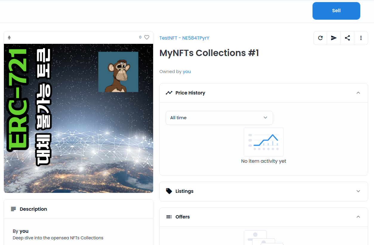 NFT 화면으로 접속하면 지정한 Name과 Description 그리고 Image가 반영된 것을 확인할 수 있습니다. 이제 상단의 "Sell" 버튼을 클릭해서 OpenSea 테스트넷에서 NFT를 팔 수 있습니다.