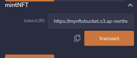 Remix에서 NFT 메타데이터 JSON 파일의 AWS S3 객체 URI를 복사해 tokenURI로 사용합니다. 트랜잭션을 실행하면 NFT 민팅이 바로 진행됩니다.