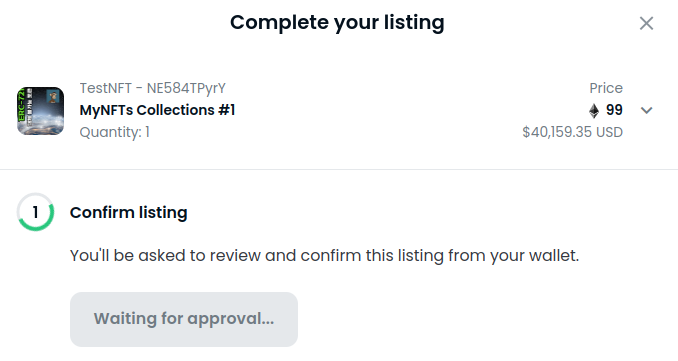 Complete Listing을 하면 2번의 서명을 해야 됩니다. 첫번째 서명은 OpenSea에 해당 컨트랙트의 approve 함수를 실행하는 과정입니다. 즉 OpenSea가 내가 소유한 NFT를 사용할 권한을 위임하는 과정입니다.