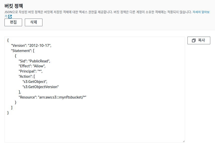 버킷 접근 권한 정책 설정에서 아래 코드를 복사해줍니다. 퍼블릭 접근 권한을 설정하는 statement입니다.
