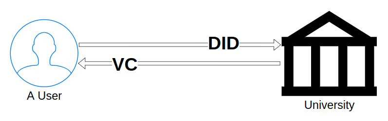 ① 먼저 대학 졸업 증명서는 분산원장에 기록되어 있습니다. 대학(신원 정보 발행자, Issuer)에게 자신의 신원증명정보(DID)를 제공한 후 대학 증명 졸업서(VC)를 전달받습니다.
