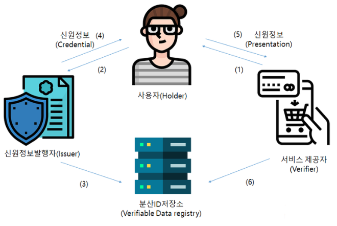 Verifiable Data Registry(검증 데이터 저장소, 블록체인 등의 분산 저장소) : 정보주체의 식별자, Issure의 인증서, 신원증명 해지 내역, 신원증명 Schema 정보 등이 저장된 분산원장 기반 데이터 저장소로 블록체인 뿐만 아니라 Holder, Issure, Verifier가 합의한 분산원장도 사용 가능합니다.