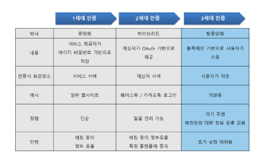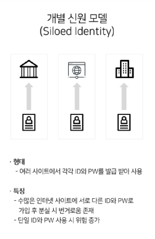 또한 사용자 측면에서도 사이트 별로 비밀번호가 다르고, 생성방식도 다르기 때문에 일일이 기억한다는 건 불가능에 가깝습니다. 즉 개별 신원 모델의 경우 정보보호의무가 서비스 제공자에게 가중되고, 보안에는 천문학 적인 비용이 투입되게 됩니다.