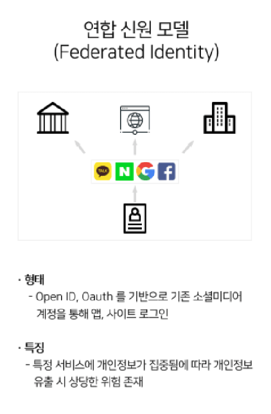 구글, 네이버, 카카오 등 신뢰할 수 있는 기관에서 연합 신원을 제공하는 모델입니다. 개별 서비스들이 개인정보를 가지지 않고, 중앙화된 서비스 제공자에 가입한 신원 정보로 ID와 Password를 관리할 수 있습니다. 중앙화된 서비스 제공자인 구글, 네이버, 카카오등 기업들은 OpenID나 OAuth를 API 형식으로 제공합니다.