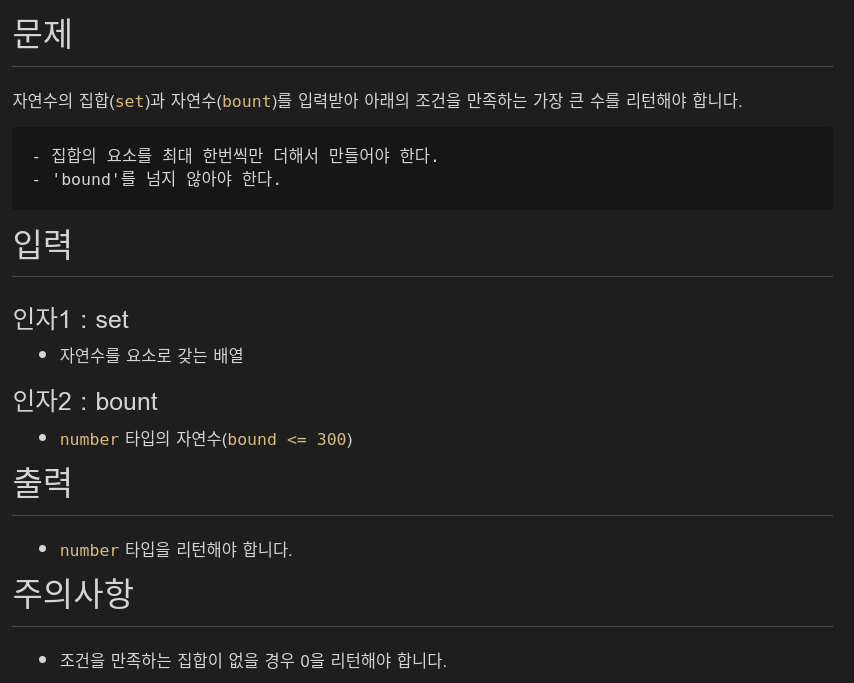 subsetSum 문제의 경우 조건으로 요소들을 더해 bound 값 이내에 들어오는 경우 해당 조합의 합을 반환하게 되어 있습니다.