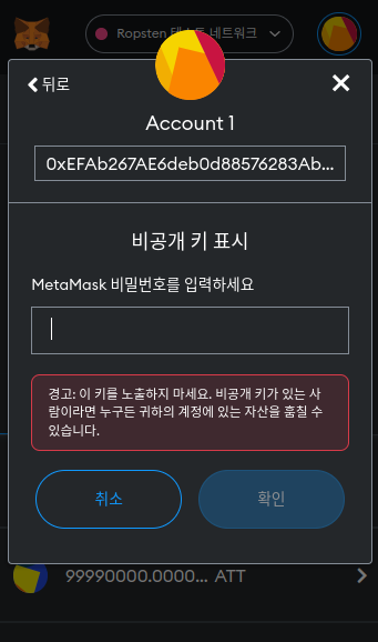 메타마스크 지갑 패스워드를 입력하면 비밀키를 가져올 수 있습니다.