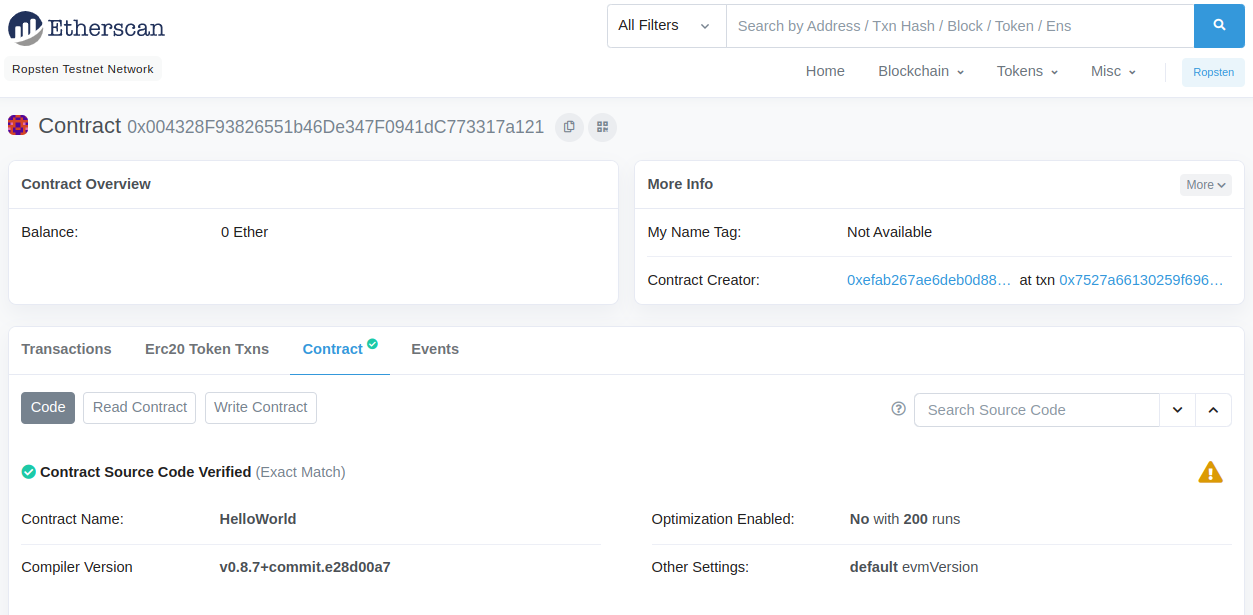 배포가 완료 된 후 ropsten etherscan으로 접속해 확인하면, 아직 Verify and Publish가 안된 것을 확인할 수 있습니다.