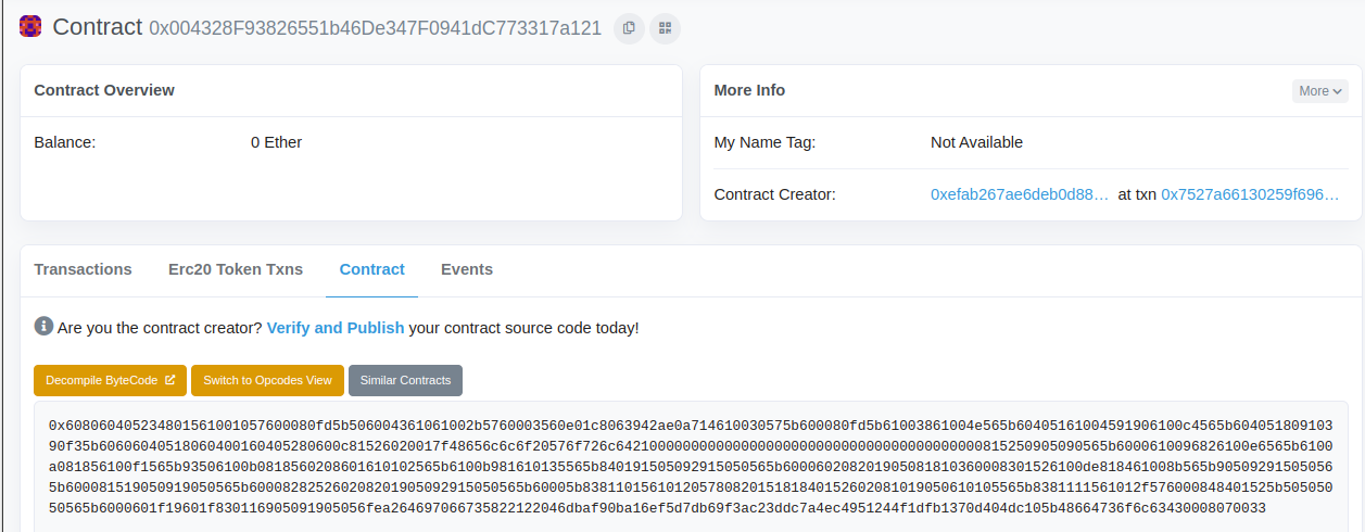 > contract address: 0x004328F93826551b46De347F0941dC773317a121