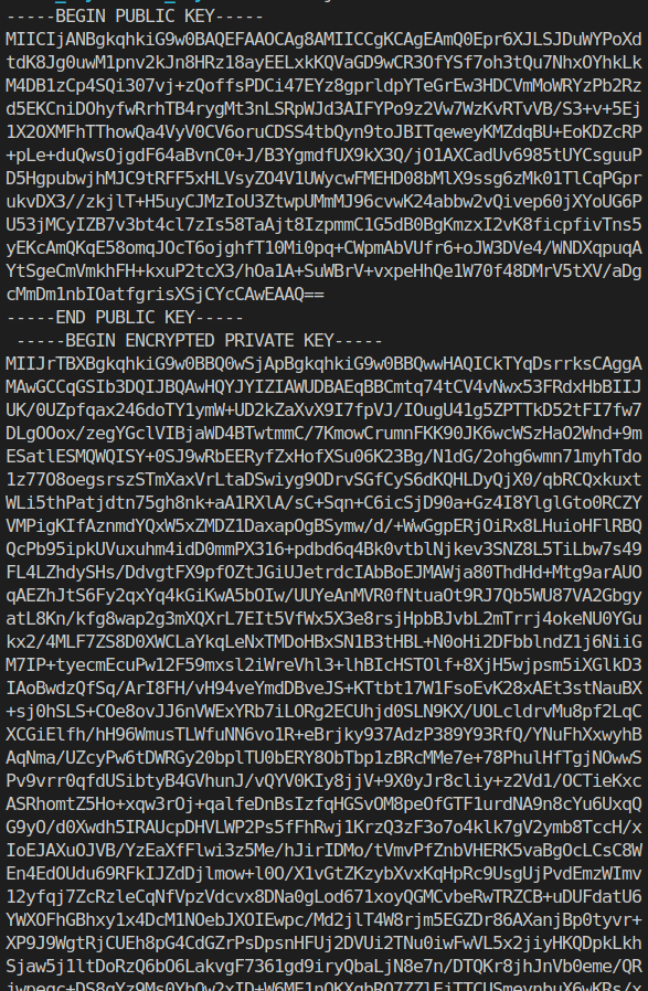 가져온 generateKeyPairSync 모듈로 pubKey와 PrivateKey 쌍을 생성합니다. 생성된 PubKey와 PrivateKey를 출력해보면 저희가 자주 볼수 있는 PEM 키처럼 생긴 KEY가 출력됩니다.