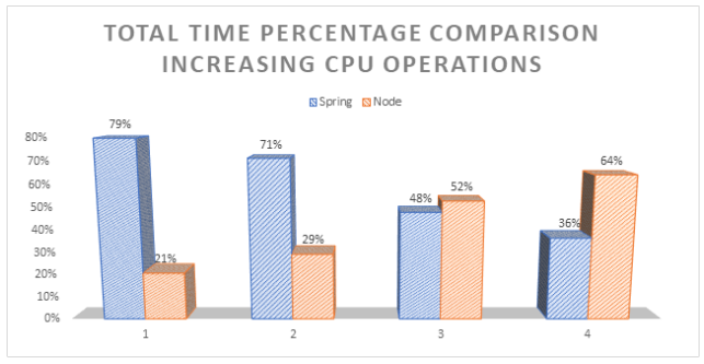 하지만 CPU 사용량을 늘리며 두 언어의 성능을 비교해보면 CPU 사용량이 늘어날 수록 Node.js 의 성능은 급격히 떨어지게 됩니다. 싱글 스레드의 한계점이 명확하게 보입니다.