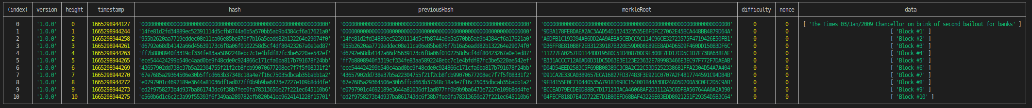 테스트 결과를 보면 아래 처럼 Genesis 블록 이후로 10개의 블록이 생성되어 체인으로 연결된 모습을 확인할 수 있습니다.